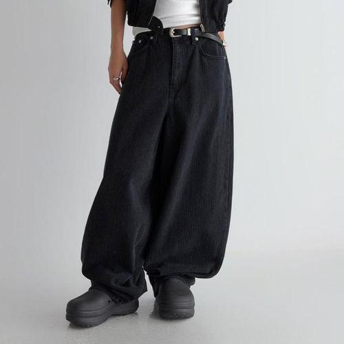 [옷자락]남녀 공용 힙한 벌룬 와이드 스트라이프 자수 포켓 청바지