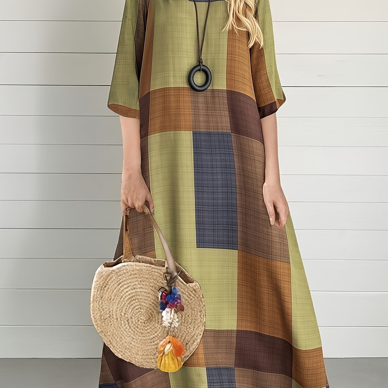 TEMU 여성 드레스, 스타일리시하고 우아한 빈티지 기하학적 체크 롱 드레스, 라운드넥, 반팔, 캐주얼, 편안하고 귀여운 드레스, 여성 의류