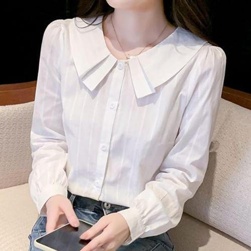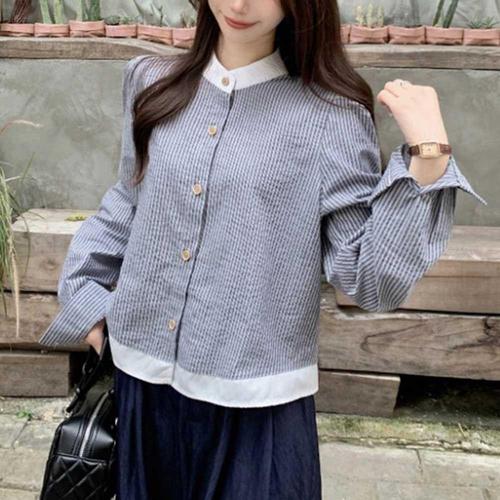 여자 슬림핏 스트라이프 카라 커프스 코튼 데일리 셔츠 블라우스