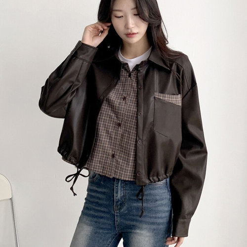 옷자락 / 여자 레이어드 체크셔츠 포켓 카라넥 스트링 가죽 점