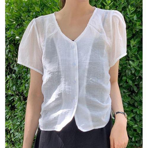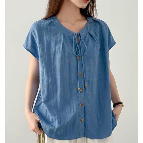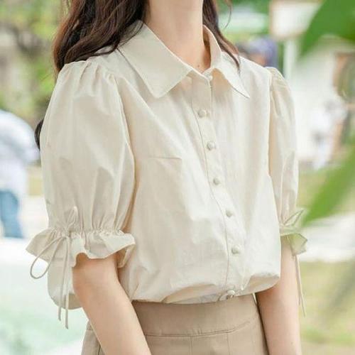 [셀러허브_여성트랜드패션]카라 셔츠 HL] 스트링 블라우스 밴딩 퍼프소매 반팔