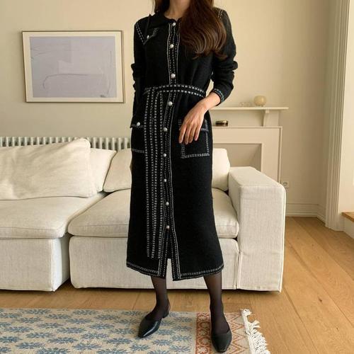 [바이어스]벨트 카라넥 스티치 배색 벨티드 니트 롱 원피스 코디 (12470433A)