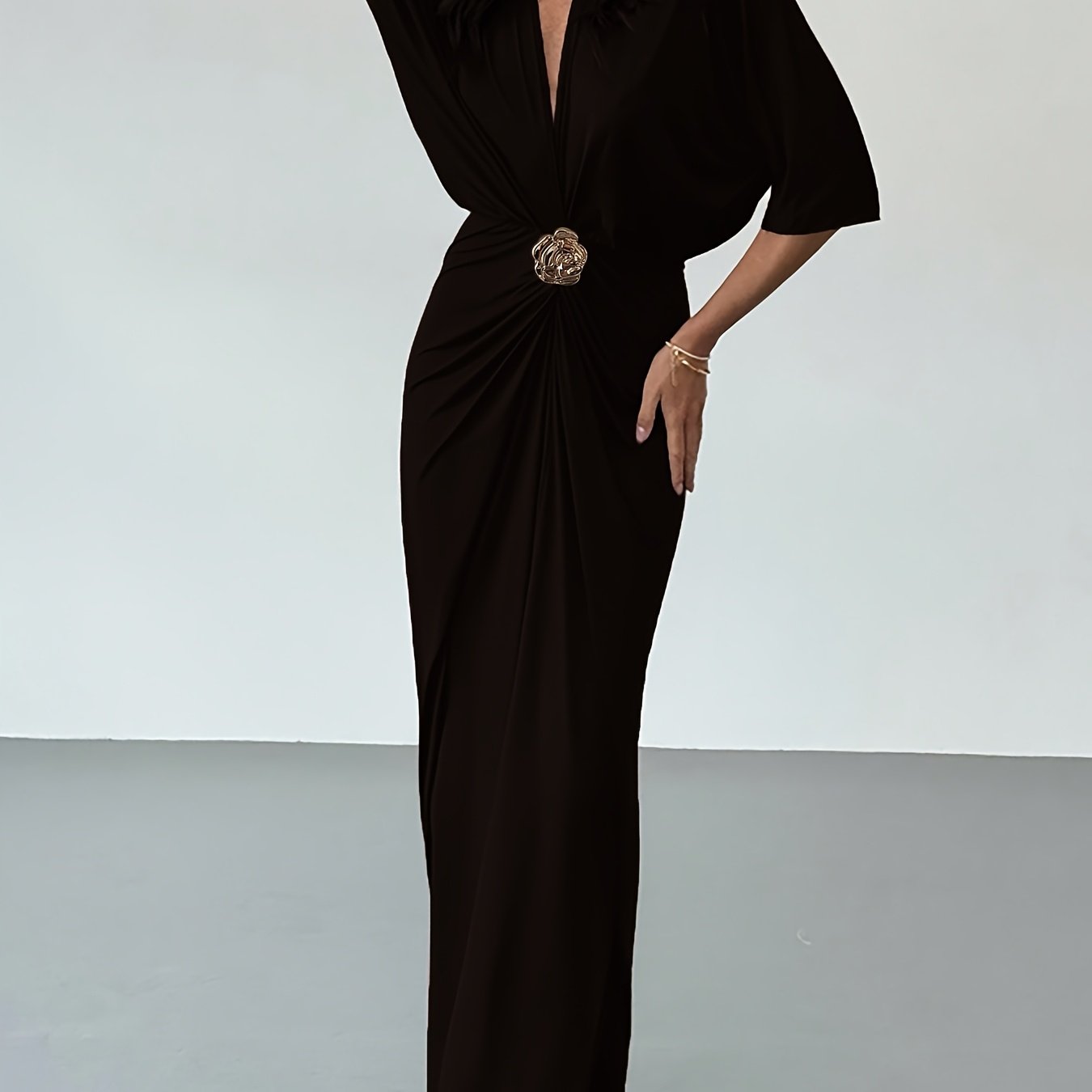 TEMU 여성용 우아하고 정교한 딥 브이넥 허리라인 오벌소매 브라운 롱데이트 메탈 플라워 버클 장식 데일리 파티 드레스