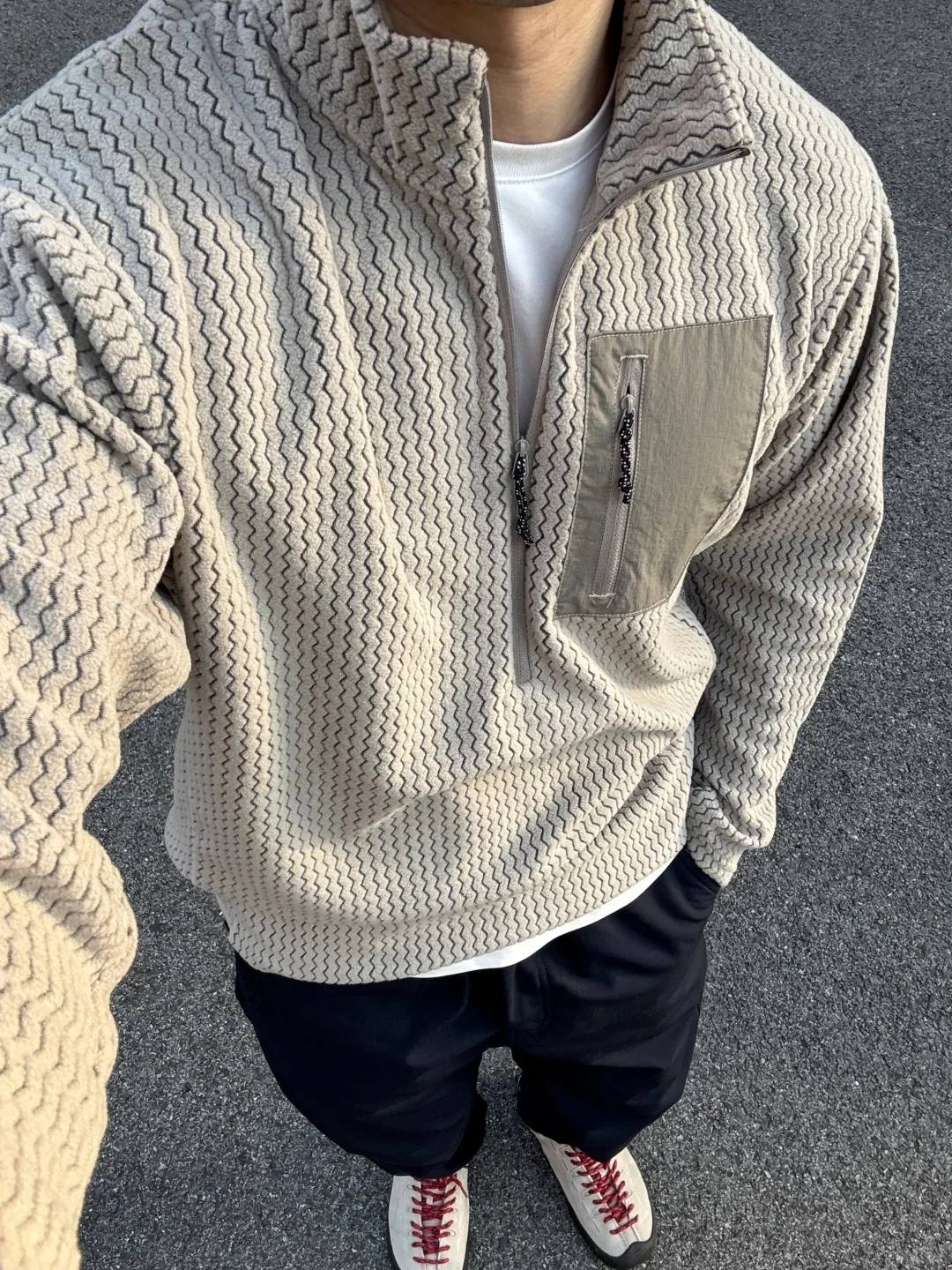 험블 스톤 아웃도어 윈드브레이커 후디 커플 스타일 하프 지퍼 플리스 보온 스탠드 칼라 웨이브 텍스처 캐주얼 웨어