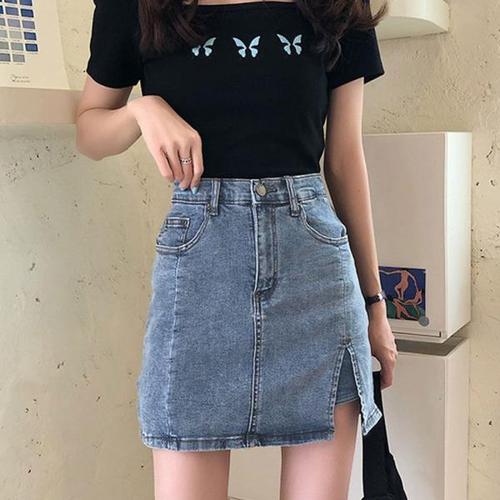 가비진 여성용 편안한 쫀쫀 스판 H라인 데님 앞트임 미니스커트 청치마