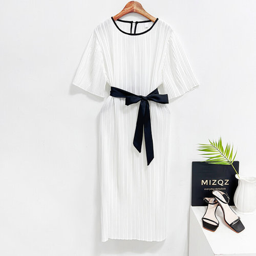 미즈큐즈 / 타이 리본 벨트 플리츠 주름 스판 반팔 롱 원피스 빅