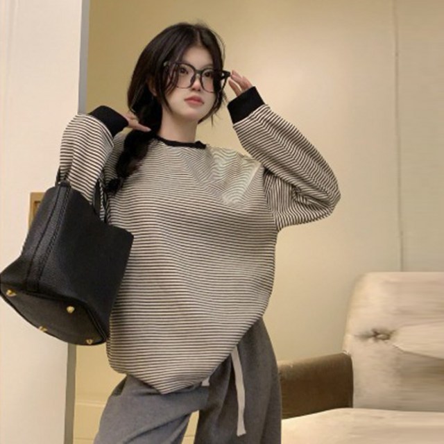 벨에라 여성 빅사이즈 사계절 루즈핏 긴팔 스트라이프 티셔츠