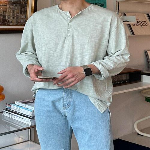 [션타운]오버핏 슬라브 헨리넥 단추 티셔츠