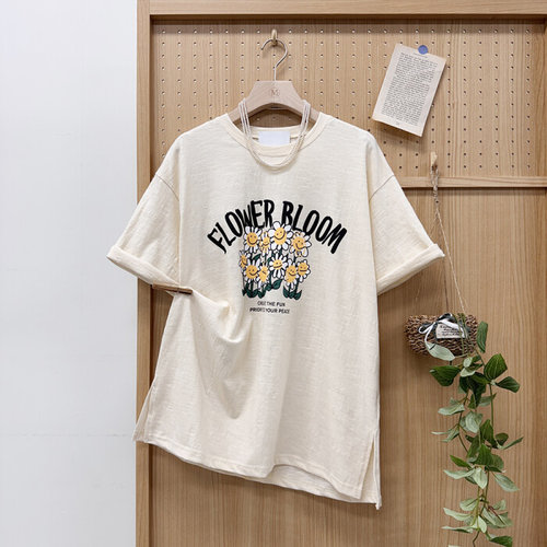 미즈큐즈 / 플라워 블룸 프린트 슬라브면 루즈핏 박시 반팔 티셔