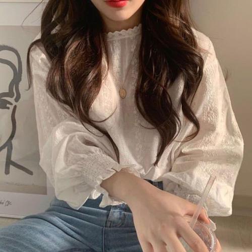 여성 프릴 리본 작은 단추 퍼프 시스루 빅 봄 블라우스