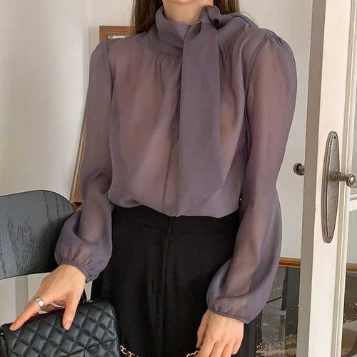 [옷자락]여자 롱타이 핀턱 봄 오피스룩 쉬폰 시스루 블라우스