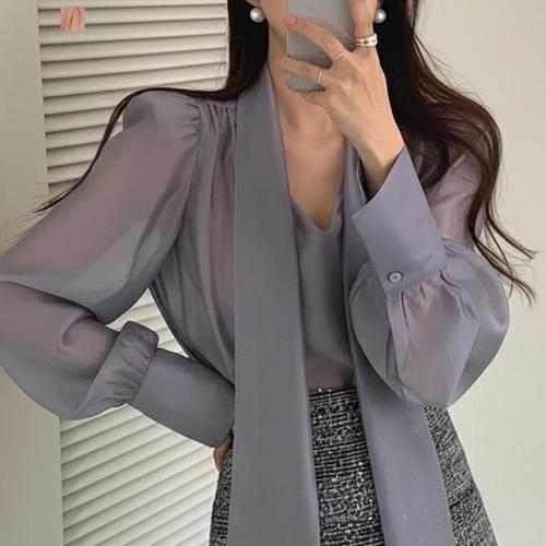 [페이릿] 엔더 모던 시스루 롱 타이 브이넥 블라우스