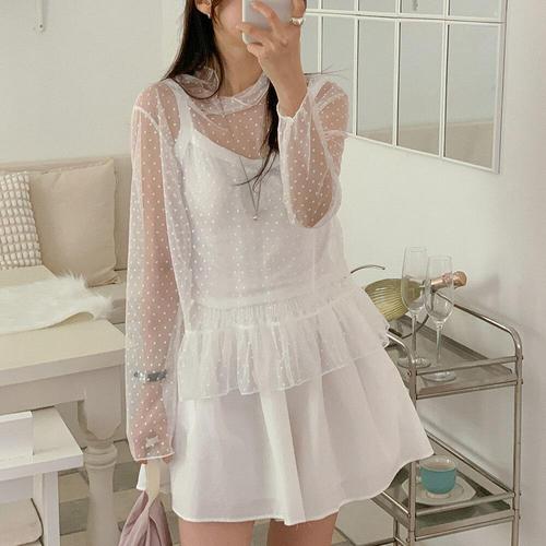 [옷자락]여자 시스루 프릴 하이넥 도트 이너 박시 블라우스