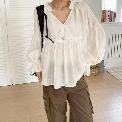 [옷자락]여자 하트버튼 시스루 플리츠긴팔 오버핏 봄 블라우스
