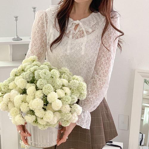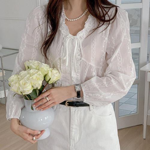 [옷자락]여자 시스루 플라워자수 리본 프릴넥 퍼프 봄 블라우스