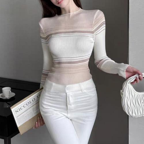 [옷자락]여자 데이트룩 데일리 시스루 스트라이프 슬림 니트