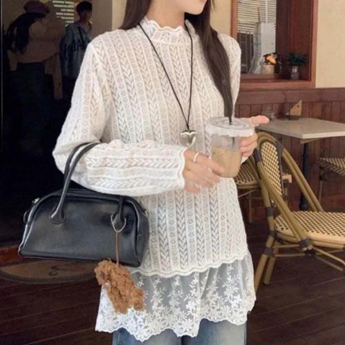 [기타브랜드]여성 시스루 레이스 터틀넥 블라우스