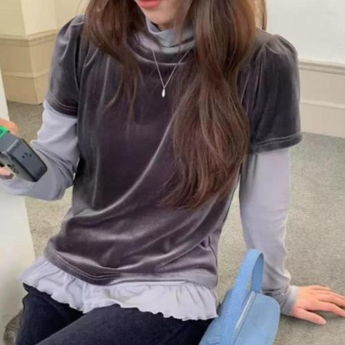 [옷자락] 여성 벨벳 레이어드 프릴 시스루 터틀넥 티셔츠