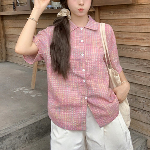 [셀러허브_여성트랜드패션]ONM 체크 셔츠 코튼 시어서커 반소매 여름 남방