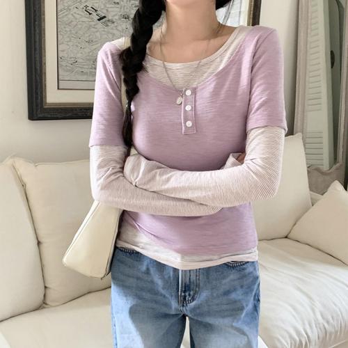[시크블랙]영에빈 버튼 보트넥 단가라 반팔 일체형 레이어드 티셔츠