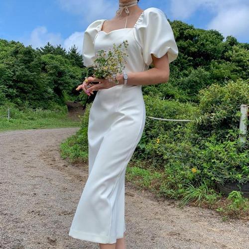 [바이어스]하트넥 퍼프 반팔 슬림핏 실크 롱 원피스 셀프웨딩 (10579479A)