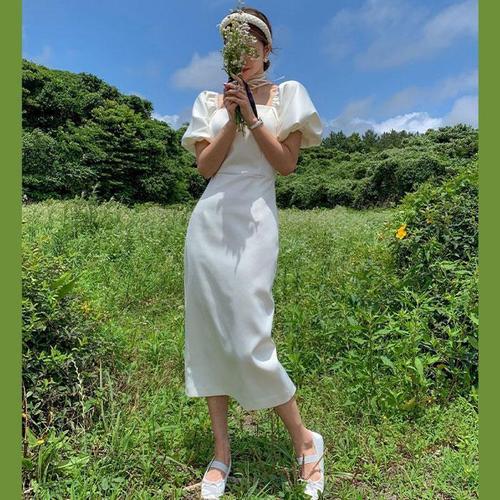[바이어스]실크 롱 원피스 셀프웨딩 실키 퍼프 반팔 드레스 (10589221A)