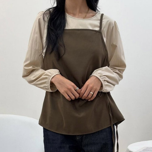 [옷자락]여성 심플 라운드넥 긴팔 뷔스티에 블라우스 세트
