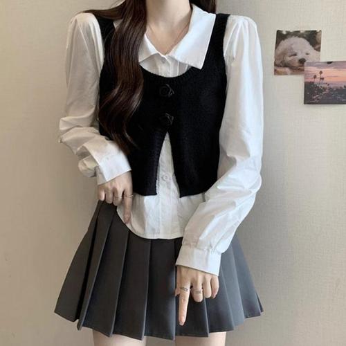 (스타일하우스) 블라우스 셔츠 브라우스 심플 뷔스티에 레이어드 조끼 여성스런 남방 세트