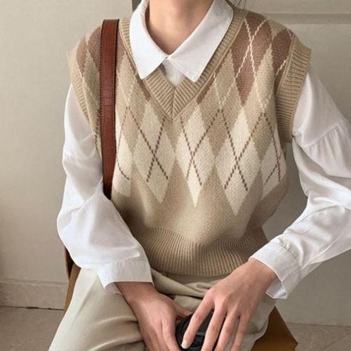 [셀럽하우스]칼라 ZQNU7497 돋보아는 아가일 패턴 여자 니트조끼 캐쥬얼코디