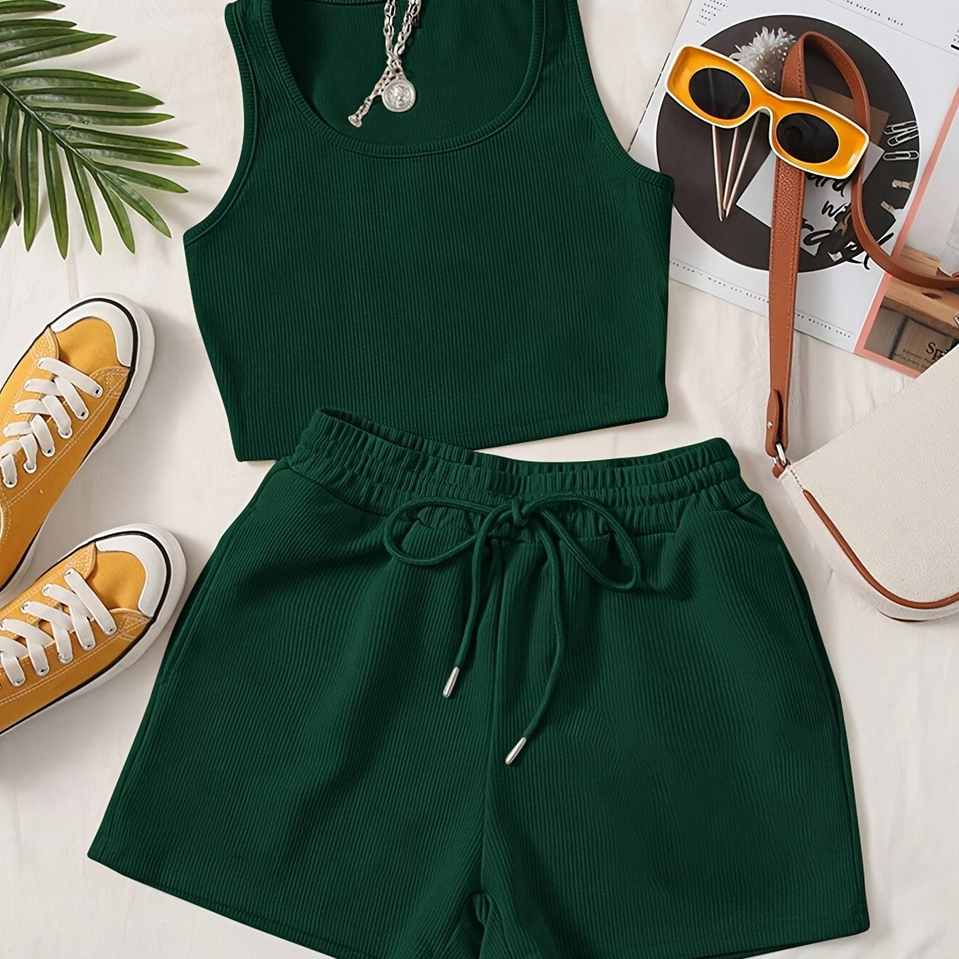 TEMU 여성용 녹색 슬리브리스 탱크 탑 & 드로스트링 반바지 세트 - 캐주얼, 단색, 폴리에스터 블렌드, 올 시즌 착용, 캐주얼 의상| 스타일|폴리에스터 블렌드