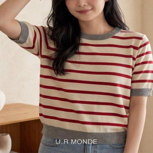[유아몽드]유아몽드 여름 신상 줄무늬 배색 반팔 니트 라운드넥