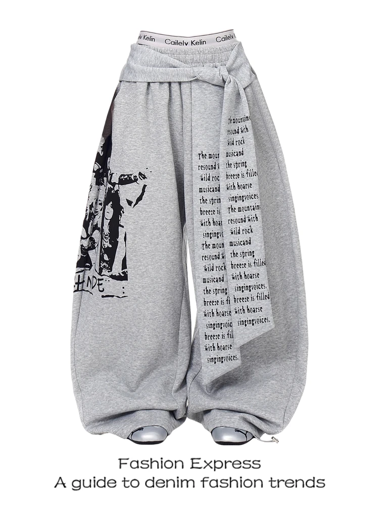 미국식 레이지 스타일 여성용 레트로 레터 프린트 벨티드 와이드 레그 팬츠 스트릿 댄스 힙합 트렌디 루즈핏 캐주얼 트라우저