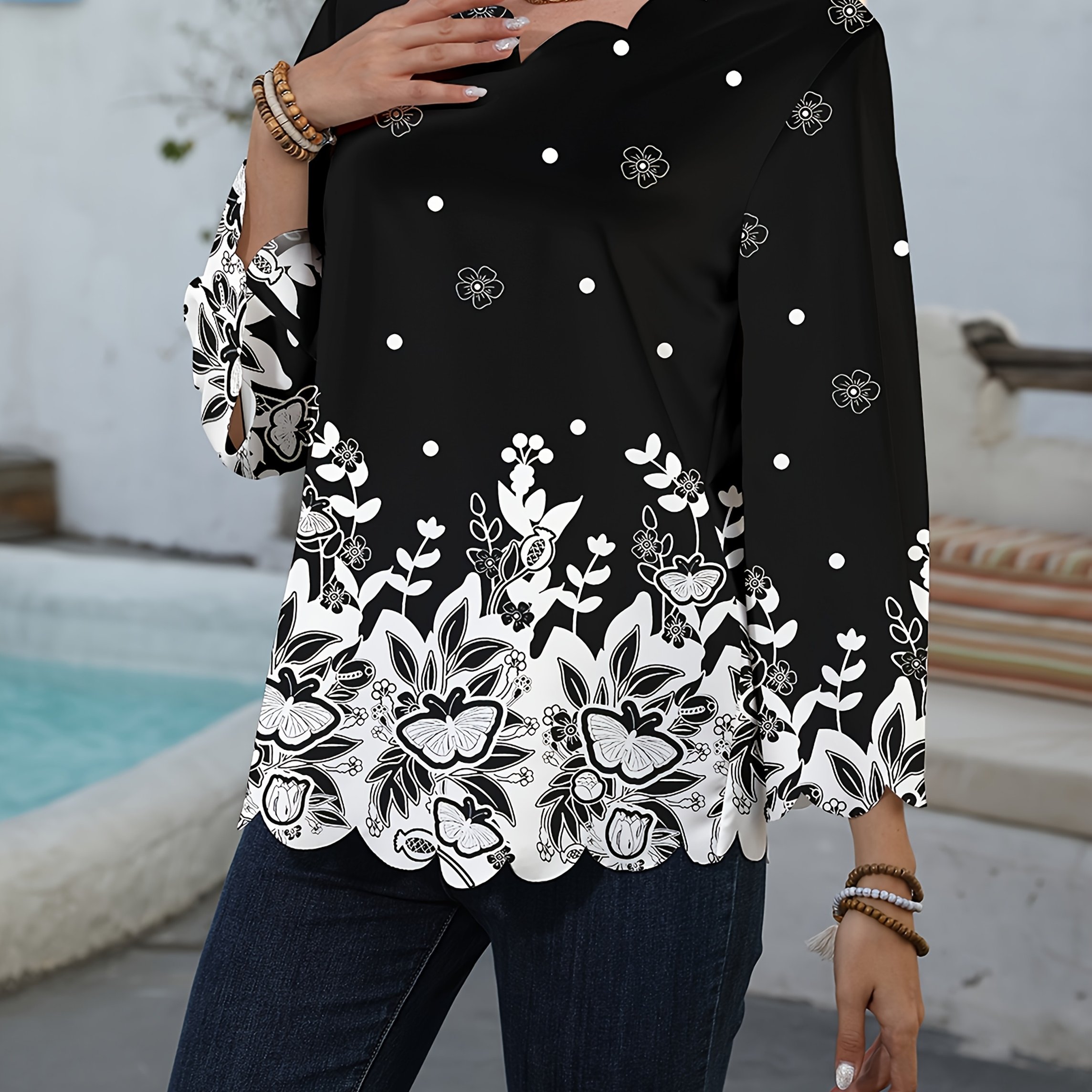 TEMU 여성용 우아한 플로럴 프린트 셔츠 - V넥과 곡선 레이스 트림, 캐주얼 휴가 스타일
