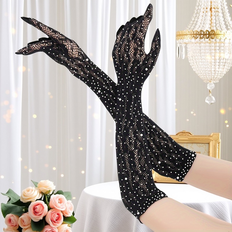 TEMU 고급스러운 인조 장식이 돋보이는 우아한 여성용 장갑. 볼, 파티, 데이트, 결혼식에 완벽하며, 반짝이는 레트로 프린트와 높은 탄성으로 특징입니다.