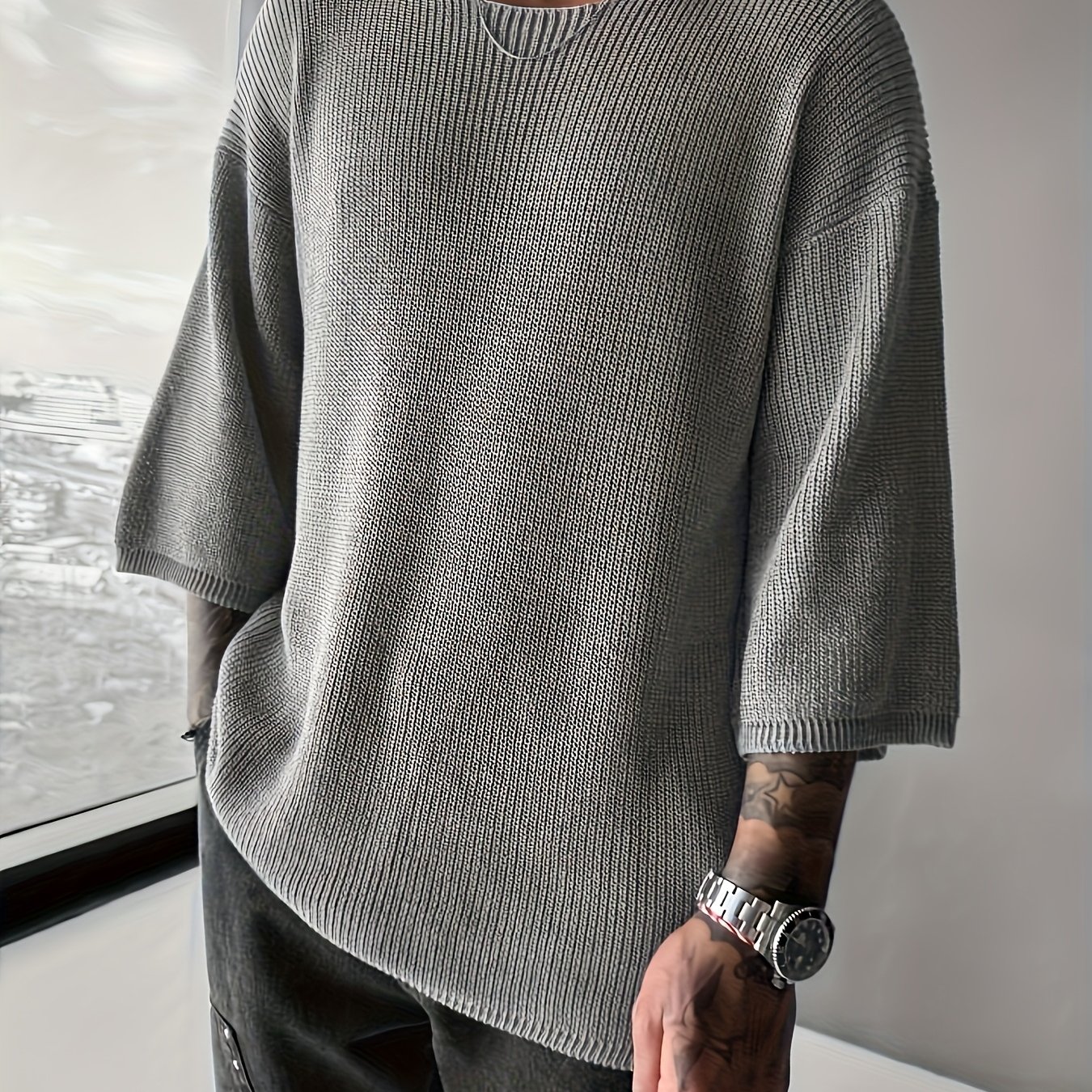 TEMU 남성용 새로운 유럽 및 미국 스타일 니트 스웨터. 라운드넥, 드롭 숄더, 7부 반팔 디자인으로 캐주얼하고 다재다능한 스트리트 스타일을 연출하며 편안한 분위기를 연출합니다.