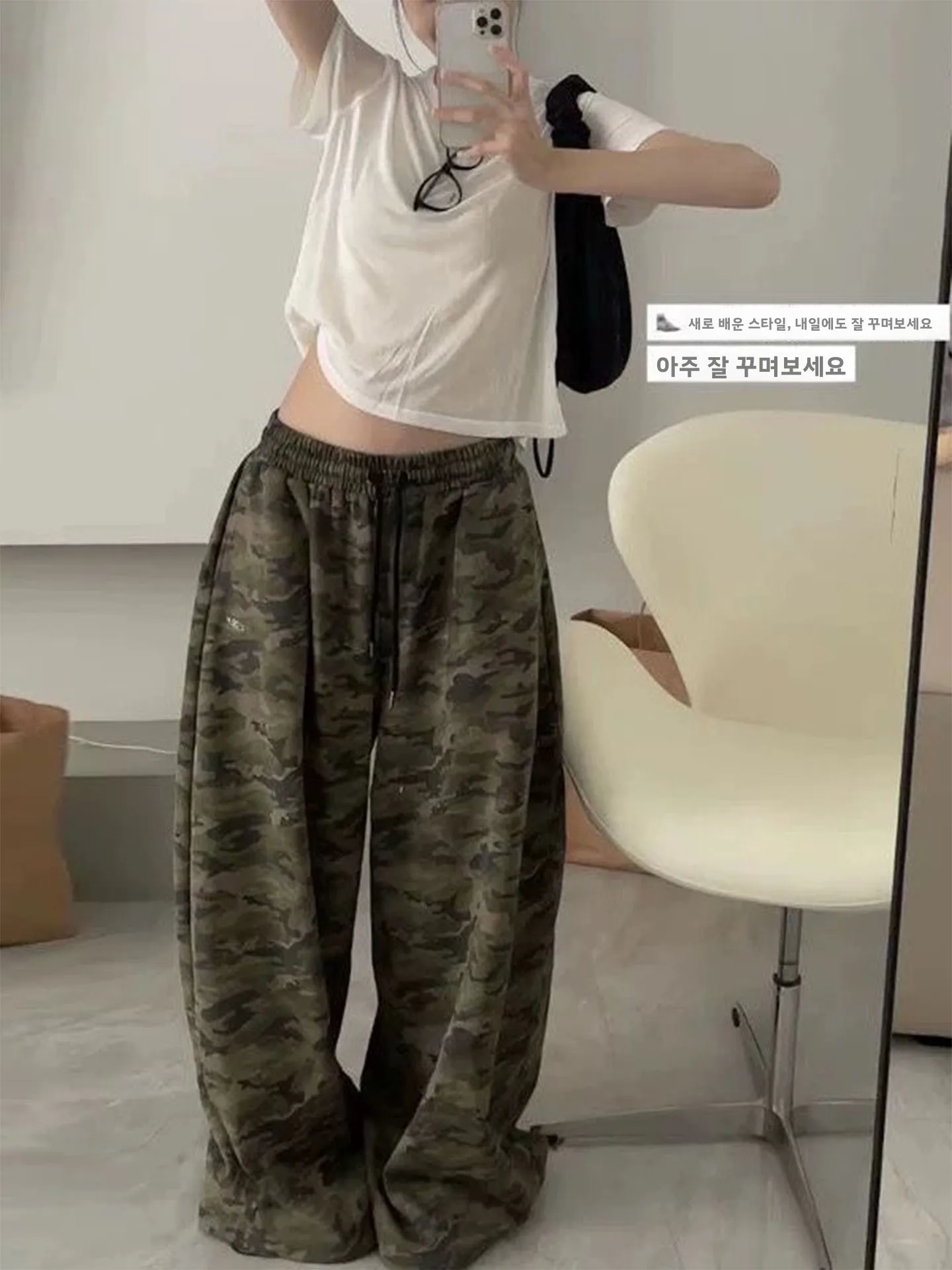여름 하이웨이스트 와이드 레그 캐주얼 카모플라주 드로스트링 아메리칸 레이지 스타일 루즈핏 트라우저 스웨트팬츠 여성 패션
