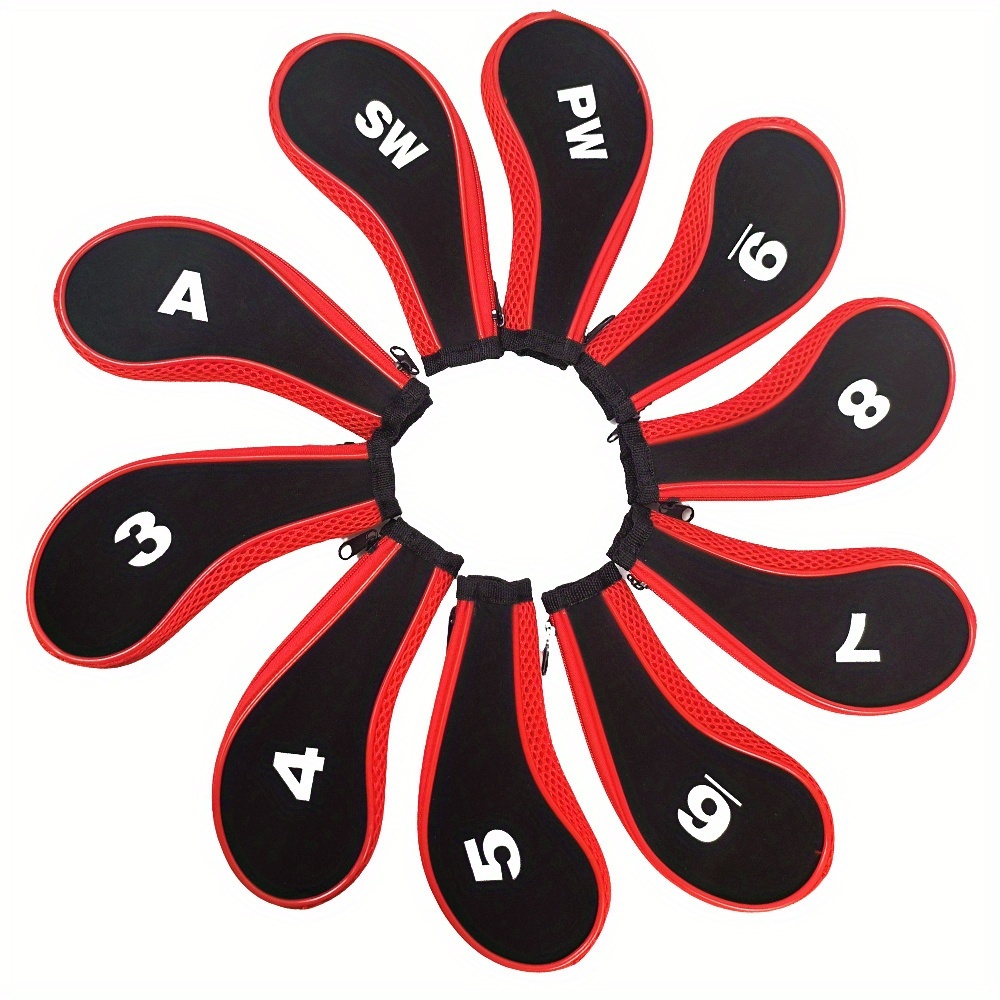 TEMU 레드 & 블랙 색상의 메시 지퍼 롱 골프 아이언 헤드커버 10개입. 클럽 긁힘 방지용으로 디자인되었으며, 골프 코스에서 사용하기 좋고 선물용으로도 좋습니다.