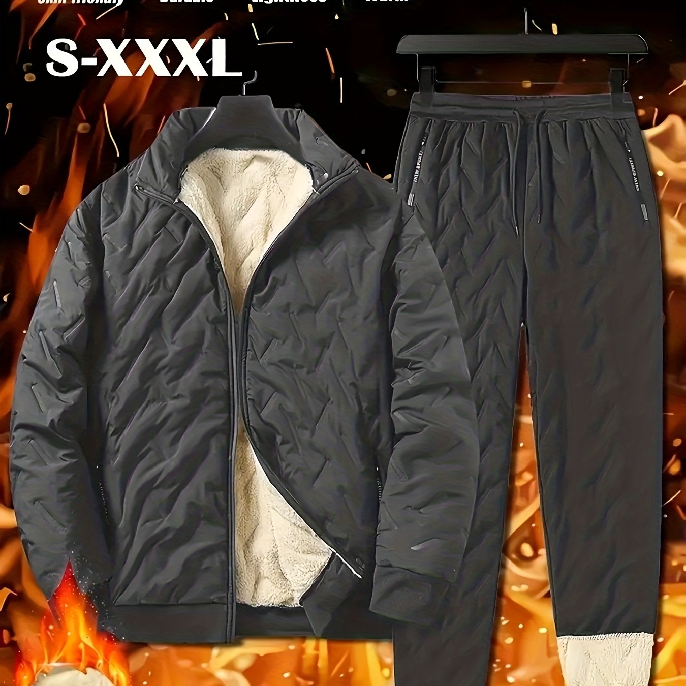 TEMU 남성 캐주얼 투피스 세트: 두꺼운 기모 안감 재킷 및 바지, 고품질 겨울 스포츠 지퍼업 후드티, 드로스트링 포켓이 있는 탄성 허리 밴드, 단색 다용도 홈 아웃도어 스키용 방풍 보온 플러시 복합 보온 속옷 상의