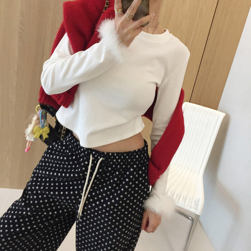 아이미마인 / 퍼소매 라운드 스판 피치기모 언발 세미크롭 겨울 긴팔티셔츠 (2color)