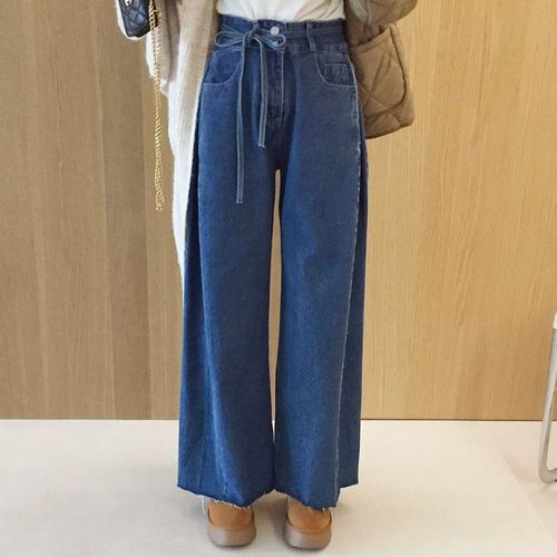 아이미마인 / 두컬러 투버튼 하이웨스트 허리끈 사이드 핀턱 와이드 청바지 (2color)