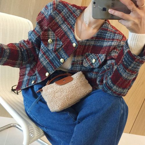 아이미마인 / 골든 노카라 라운드 금장단추 배색체크 트위드 겨울자켓 (3color)