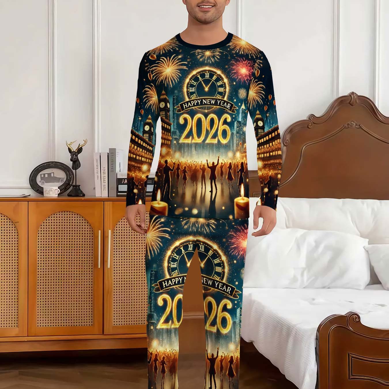 TEMU 남성 캐주얼 잠옷 세트 - 긴소매, 긴 바지, 라운드넥, 레귤러 핏, 가을/겨울에 적합, 편안한 라운지웨어 | 체크 패턴 | 신축성 있는 원단, 완벽한 크리스마스 선물|파자마