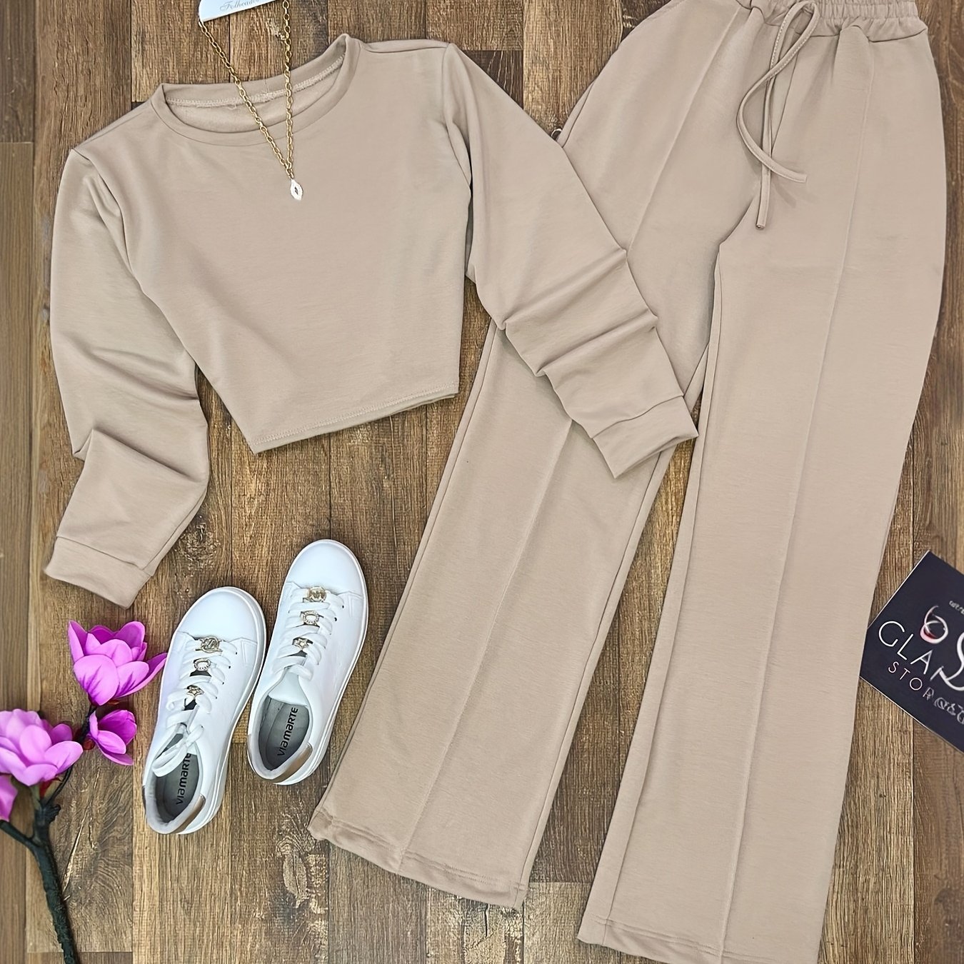 TEMU 여성용 Y2K 캐주얼 엘레강스 긴소매 크루넥 크롭 탑 & 하이웨이스트 와이드핏 와이드레그 팬츠, 캐주얼 데일리 다용도 의류용