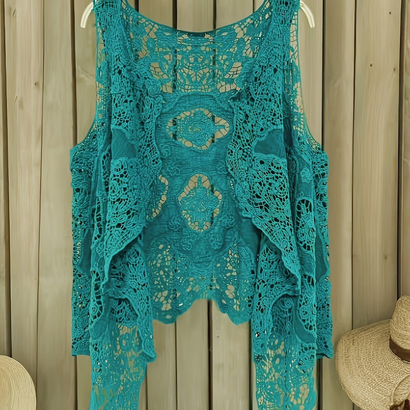 TEMU 스타일 여성용 오픈 프론트 카디건, 미디엄 길이 스웨터, 얇은 크로셰 소매 없는 커버업 수영복용
