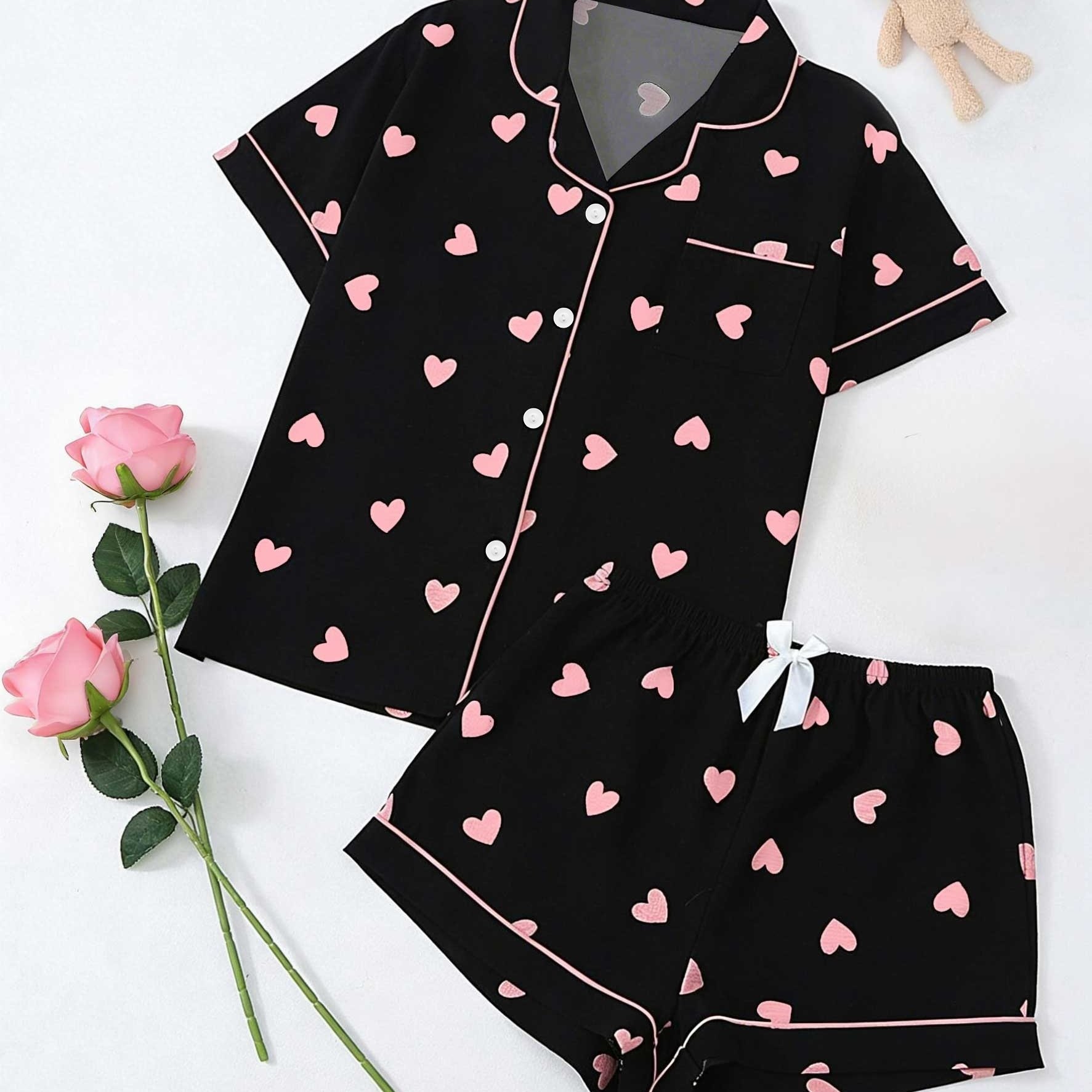 TEMU 로즈리프 우아한 여성용 파자마 세트 - 하트 패턴 V넥 반팔 상의 및 바지, 가벼운 라운지웨어