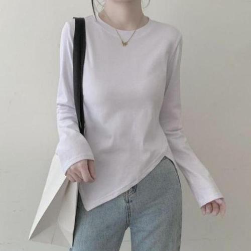 SAHINER 봄가을 여성 심플 무지 루즈핏 긴팔 언발 트임 크롭 라운드넥 티셔츠 LWAWY52