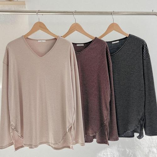 [옷자락]여성 긴팔 스트라이프 언발 기모 후리스 티