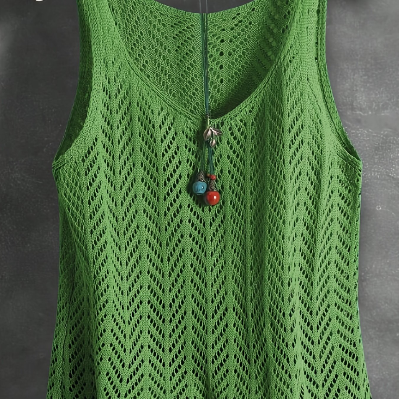 TEMU 패셔너블 트렌디 그린 할로우 여성용 V넥 캐주얼 조끼 | 단색, 할로우 패턴, 레귤러 핏, 봄/여름/가을에 적합