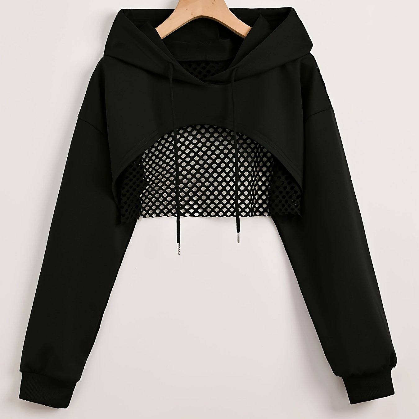 TEMU 여성용 시크한 단색 후드티 메쉬 패널 디테일 - 캐주얼 긴팔, 봄/여름/가을용 폴리에스테르 크롭탑 - 스타일리시하고 편안한 끈 조절 후드, 오버사이즈 후드티