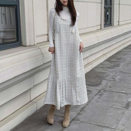 [다잇템] 여성 트위드 롱 에이라인 슬리브리스 귀여운 후레아 원피스